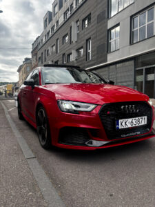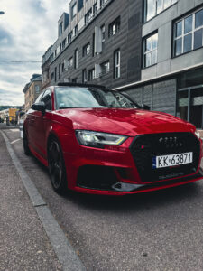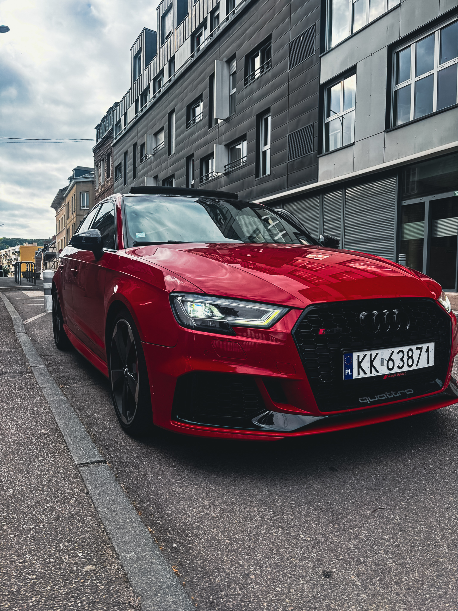 Photographie d’une Audi RS3 rouge stationnée en ville. Mise en valeur des lignes sportives et du contraste avec l’environnement urbain. Sur les deux photos, qui ne sont pas retouchées de la mêmes façon, j’ai voulu apporter un plus à la voiture pour voir d’avantages les courbes et cette ligne sportive du RS3