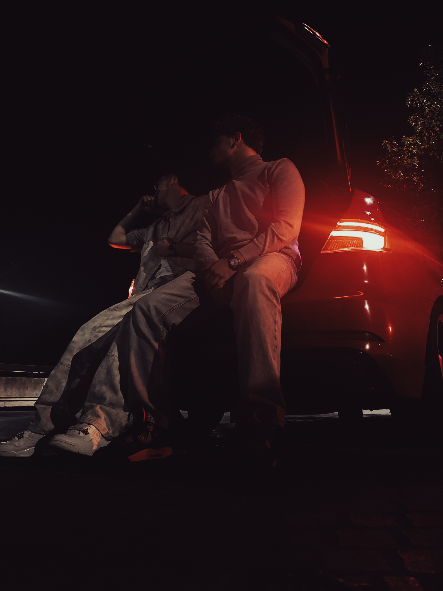 Cliché nocturne mettant en scène deux personnes assises sur le coffre d’une voiture, éclairées par les feux arrière. La composition joue sur les contrastes d’ombre et de lumière, créant une atmosphère douce et introspective, accentuée par les reflets rouges des feux.