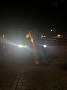 Prise de vue nocturne réalisée lors d’un shooting informel avec des amis. L’image capture une silhouette devant les phares d’une voiture, créant un contraste saisissant entre la source lumineuse et l’obscurité ambiante. L’objectif était d’explorer les effets de lumière urbaine et de créer une atmosphère mystérieuse.