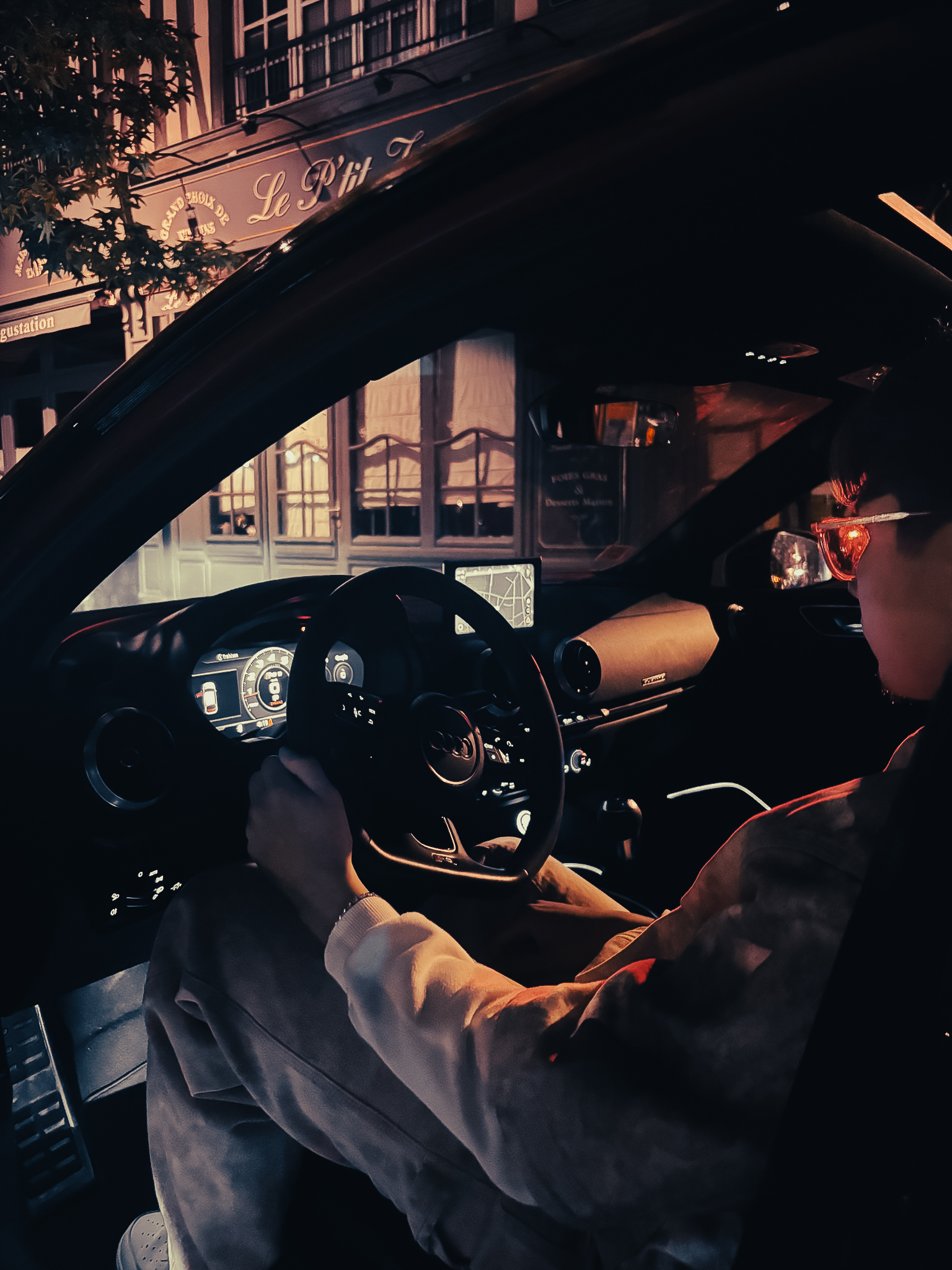 Photographie de nuit axée sur l’éclairage d’ambiance et les détails. J’ai capturé l’interaction entre les lumières du tableau de bord, les reflets sur les vitres et l’environnement urbain en arrière-plan. L’objectif était de mettre en valeur l’expérience de conduite nocturne et l’esthétique intérieure du véhicule.